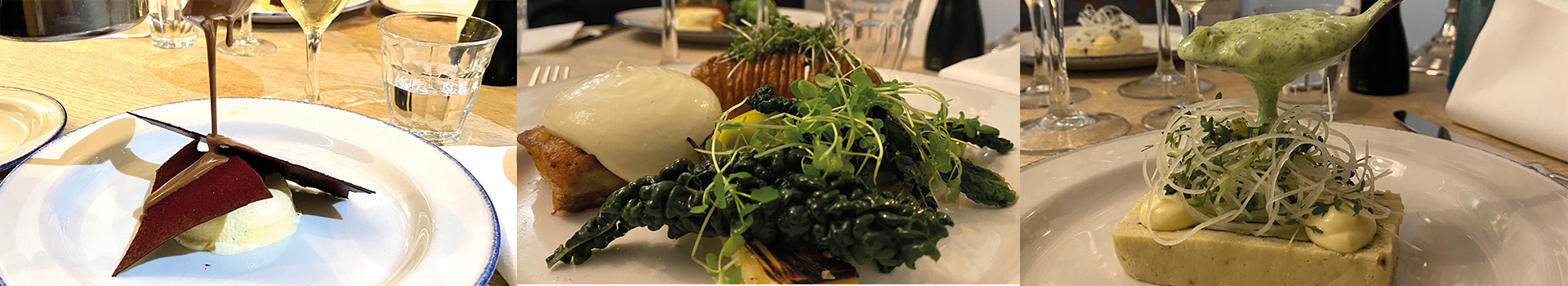 Pandestegt sej serveret med stegte porre, kål anrettet med syltet aroniabær, confiteret kartoffel med rosmarinsmør og brunet hollandaise.