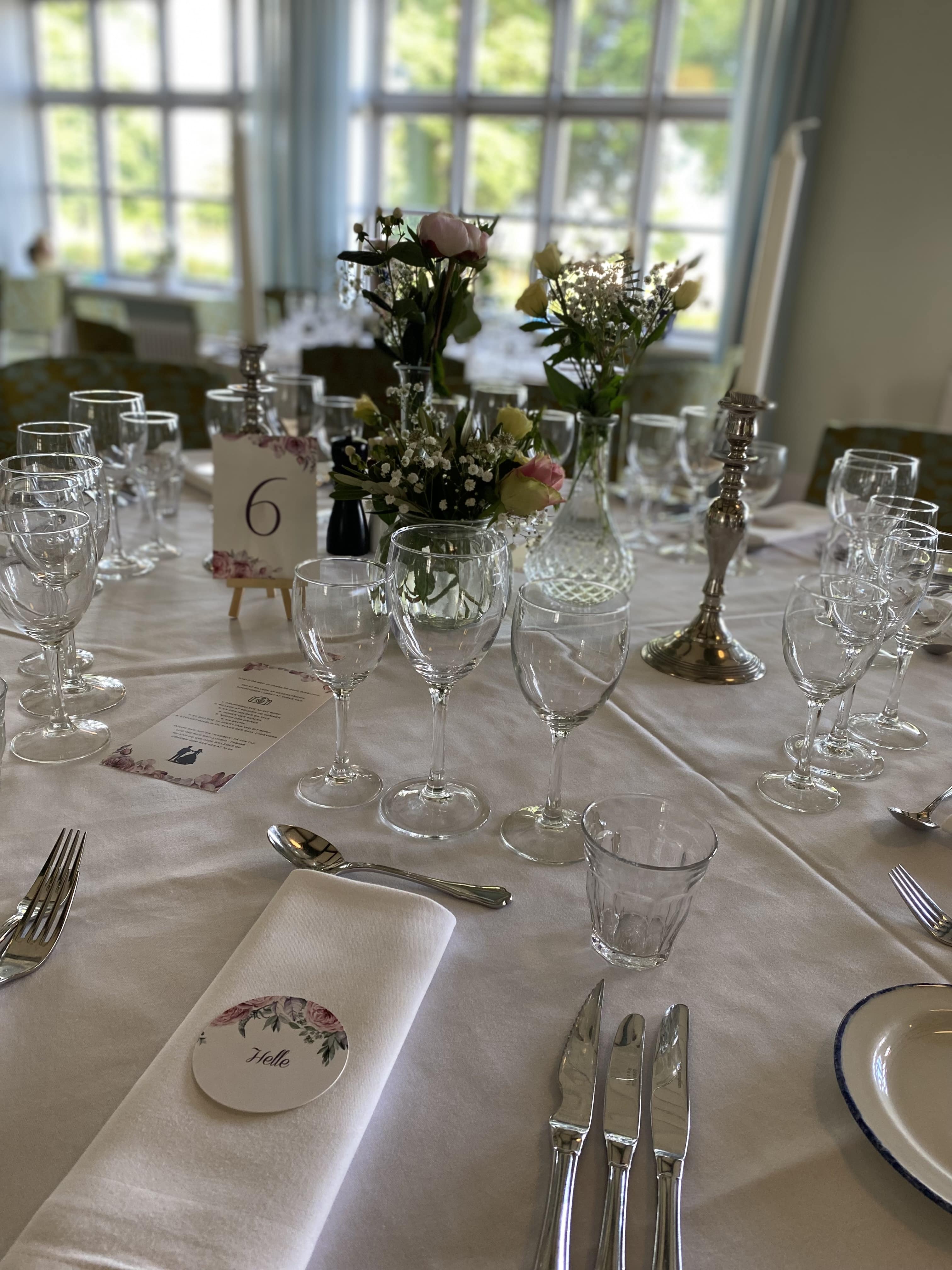 Vi dækker, med mindre andet aftales, op med hvide duge, hvide lys eller hvide LED lamper og hvide servietter samt enkel blomsterpynt.